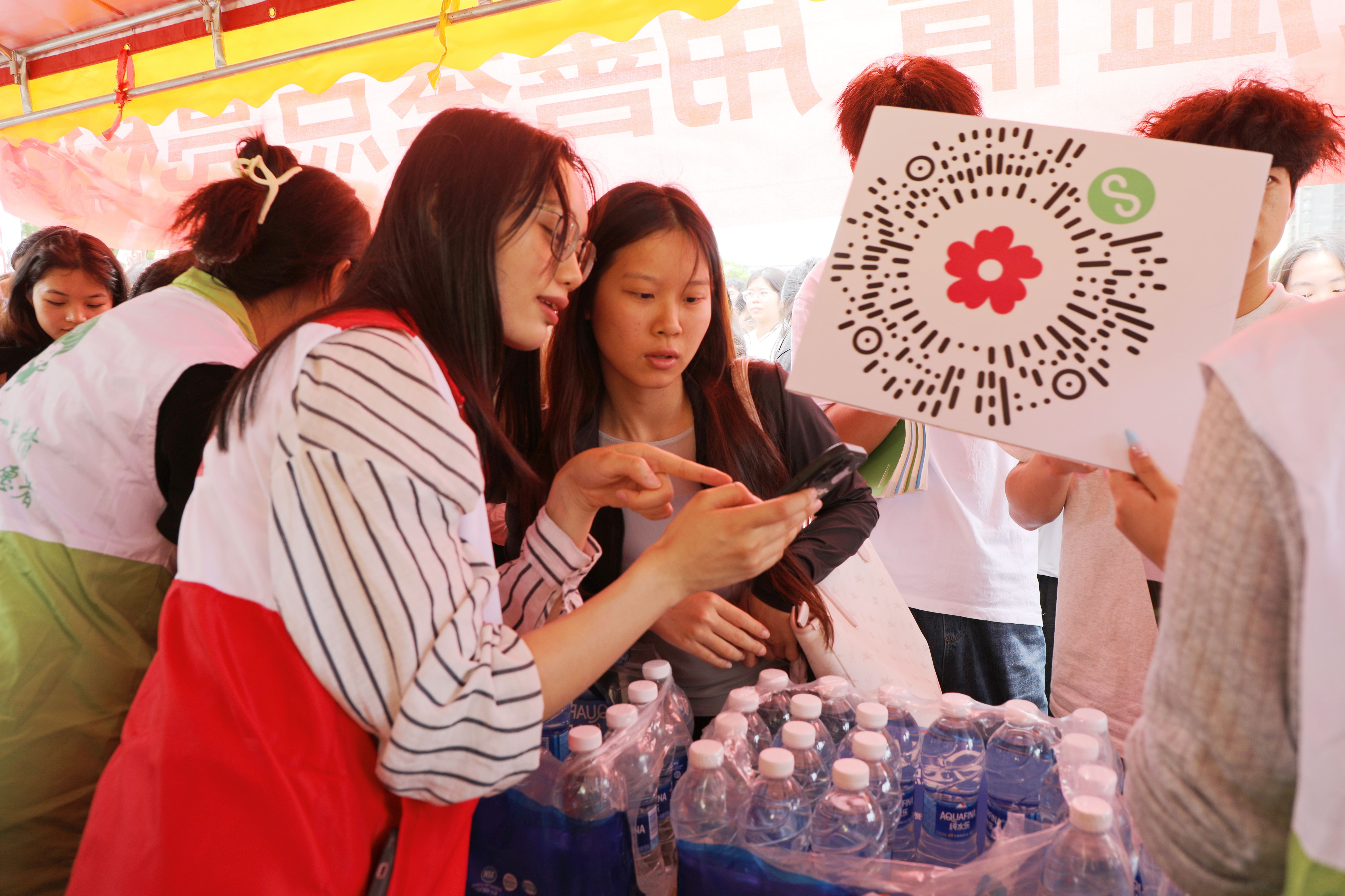 活动期间,学校在神龙广场、第一食堂旁设置公益互动展区,国际商务学院“小桑叶”志愿服务队通过现场宣导、扫码捐赠、公益知识问答、拍照打卡等互动形式,吸引超2000人次参与。百事可乐公司定向捐赠的2000瓶爱心水成为激励青年参与的“公益凭证”,学生扫码捐赠1元即可领取价值2元的水,实现“捐赠-回馈-传播”的良性循环。