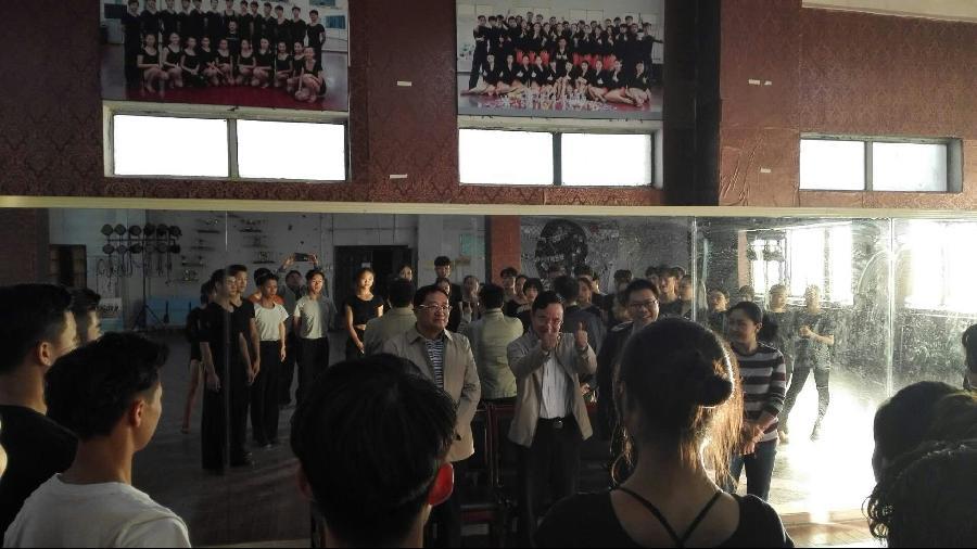 在健美操、体育舞蹈等学生训练场,看到同学们正利用课余时间紧张训练,喻晓社书记向同学们竖起了大拇指,勉励同学们保持刻苦训练、吃苦耐劳的优秀品质,不断提高自己的专业技能水平,苦练内功、外树形象,展示学校的办学实力和水平。