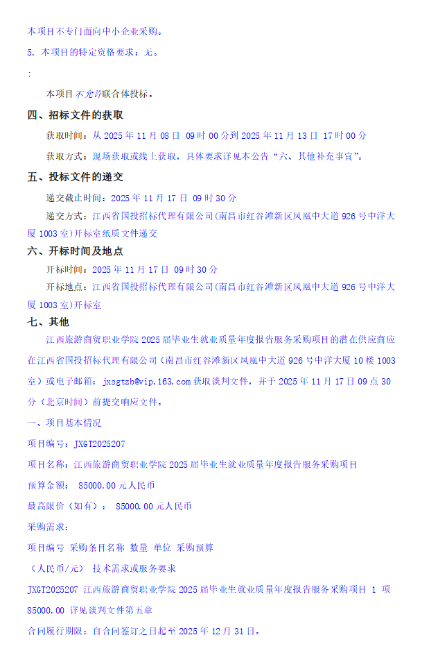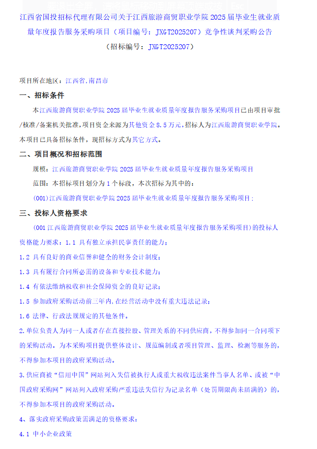 江西省国投招标代理有限公司关于江西旅游商贸职业学院 2025 届毕业生就业质量年度报告服务采购项目(项目编号:JXGT2025207)竞争性谈判采购公告(招标编号:JXGT2025207)