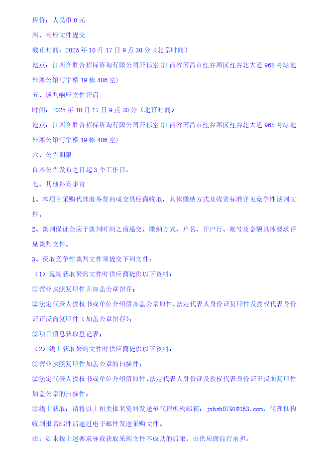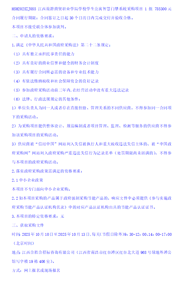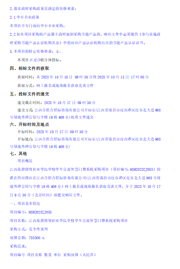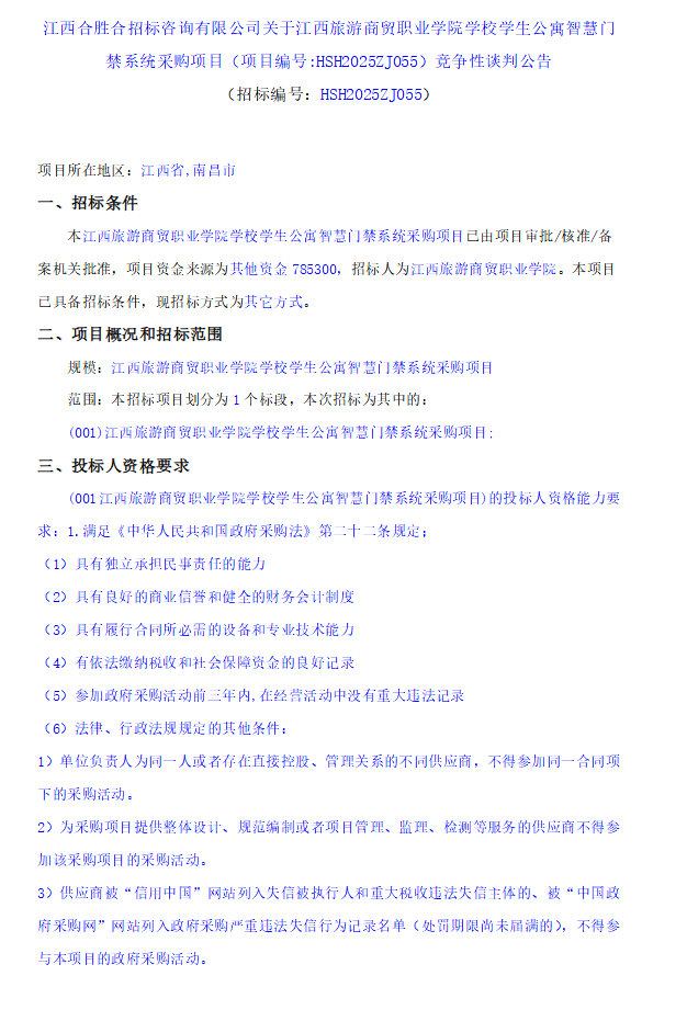 江西合胜合招标咨询有限公司关于江西旅游商贸职业学院学校学生公寓智慧门禁系统采购项目(项目编号:HSH2025ZJ055)竞争性谈判公告(招标编号:HSH2025ZJ055)