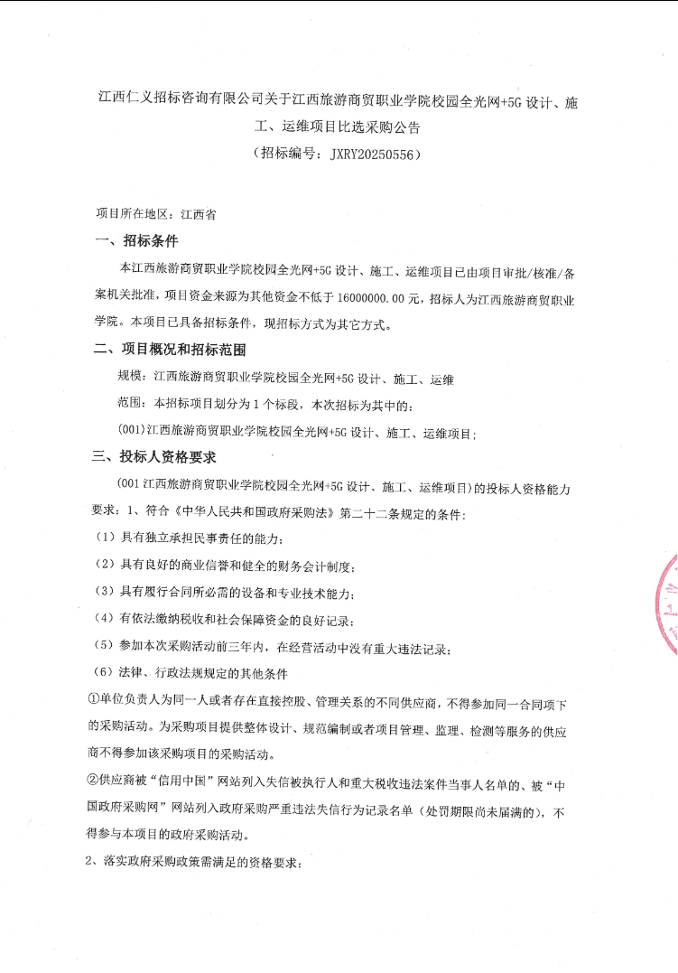 江西仁义招标咨询有限公司关于江西旅游商贸职业学院校园全光网+5G设计、施工、运维项目比选采购公告 (招标编号:JXRY20250556)