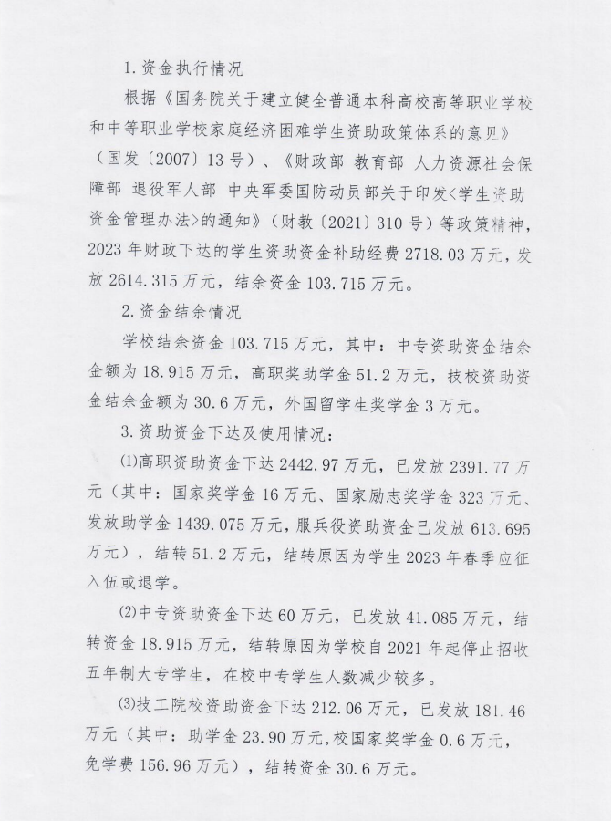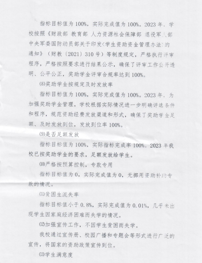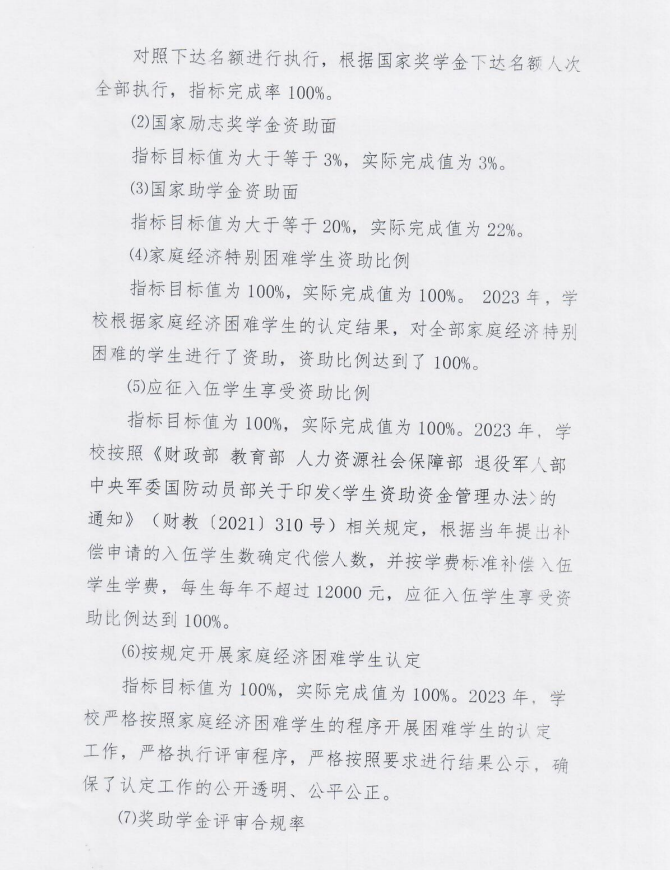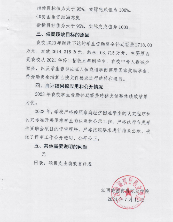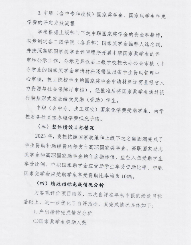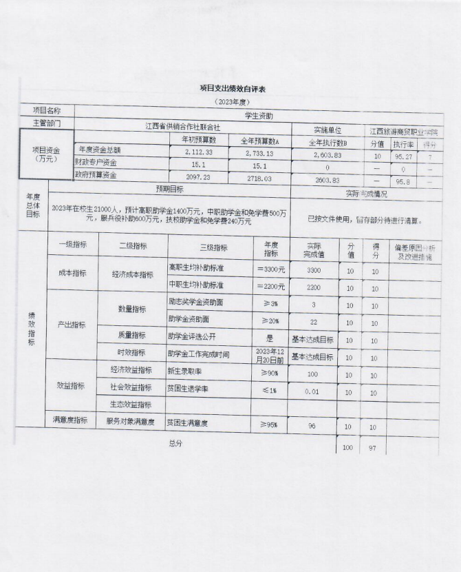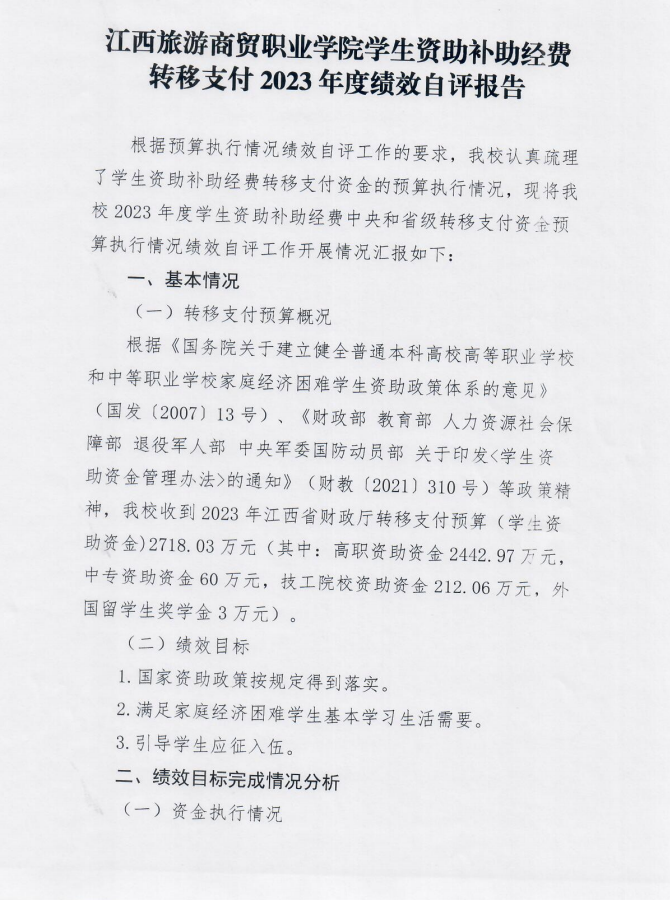江西旅游商贸职业学院学生资助补助经费转移支付2023年度绩效自评报告