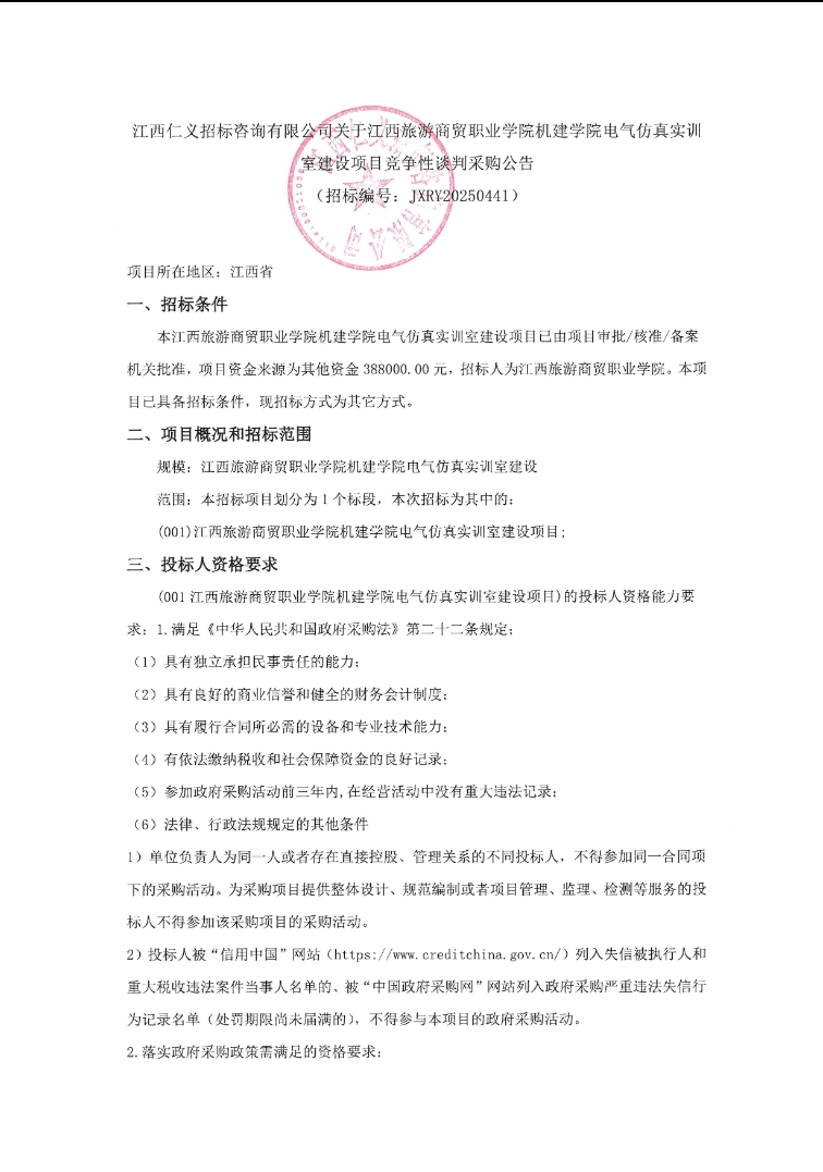 江西仁义招标咨询有限公司关于江西旅游商贸职业学院机建学院电气仿真实训室建设项目竞争性谈判采购公告 (招标编号:JXRY20250441)