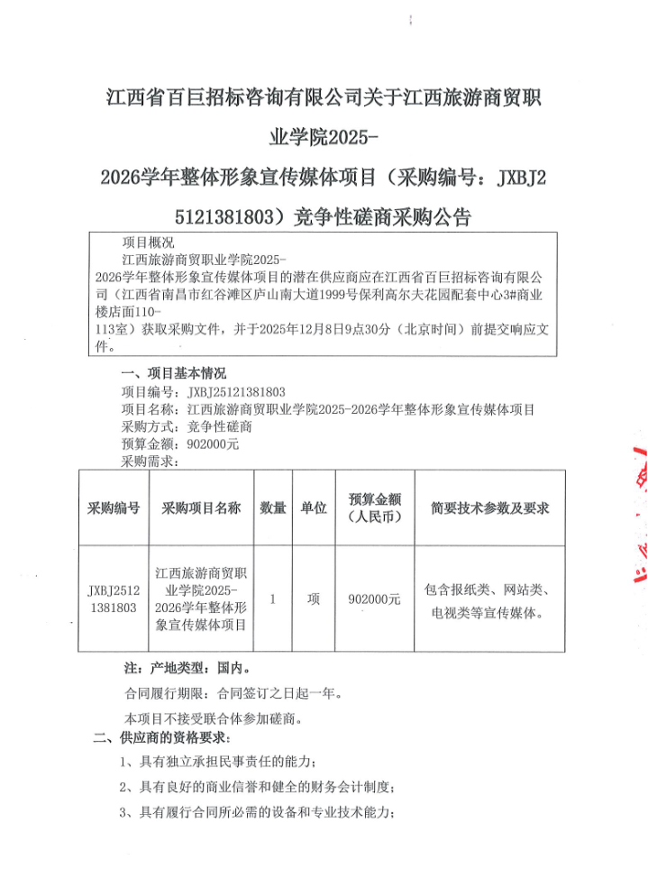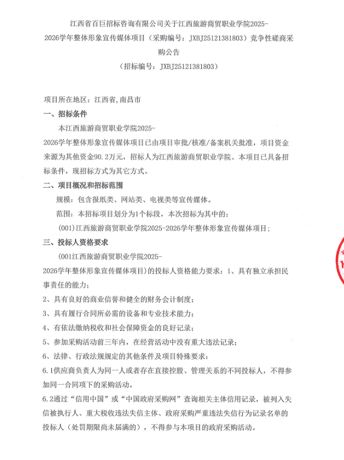江西省百巨招标咨询有限公司关于江西旅游商贸职业学院2025-2026学年整体形象宣传媒体项目(采购编号:JXBJ25121381803)竞争性磋商采购公告(招标编号:JXBJ25121381803)