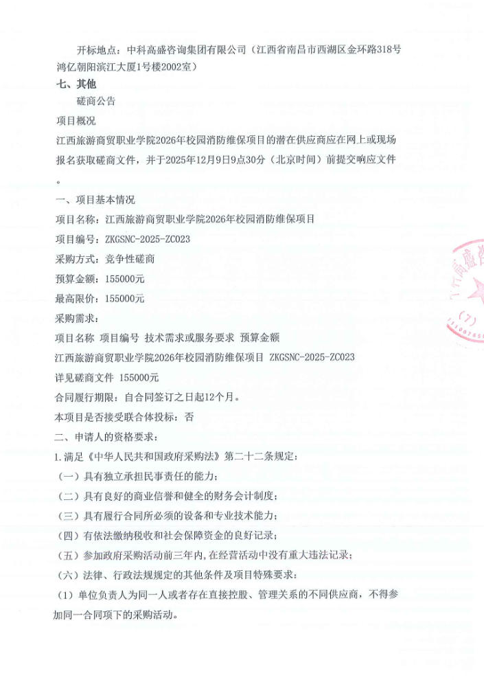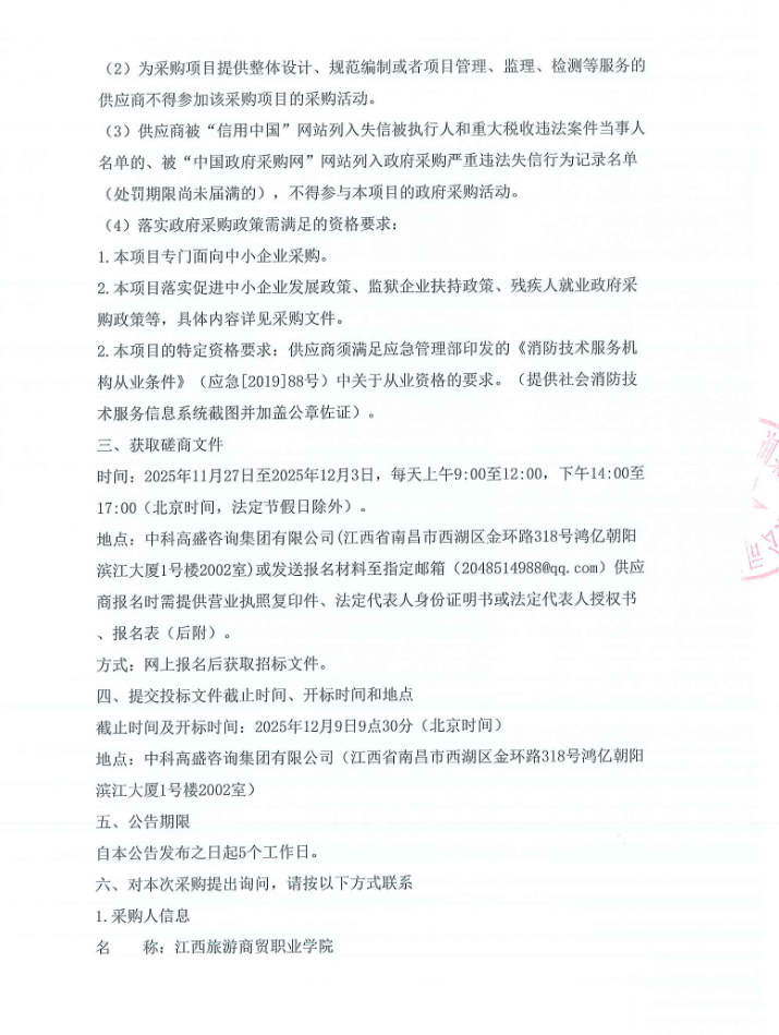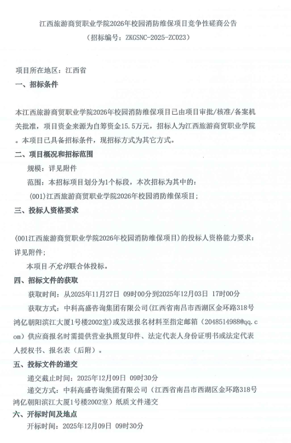 江西旅游商贸职业学院2026年校园消防维保项目竞争性磋商公告(招标编号:ZKGSNC-2025-ZC023)